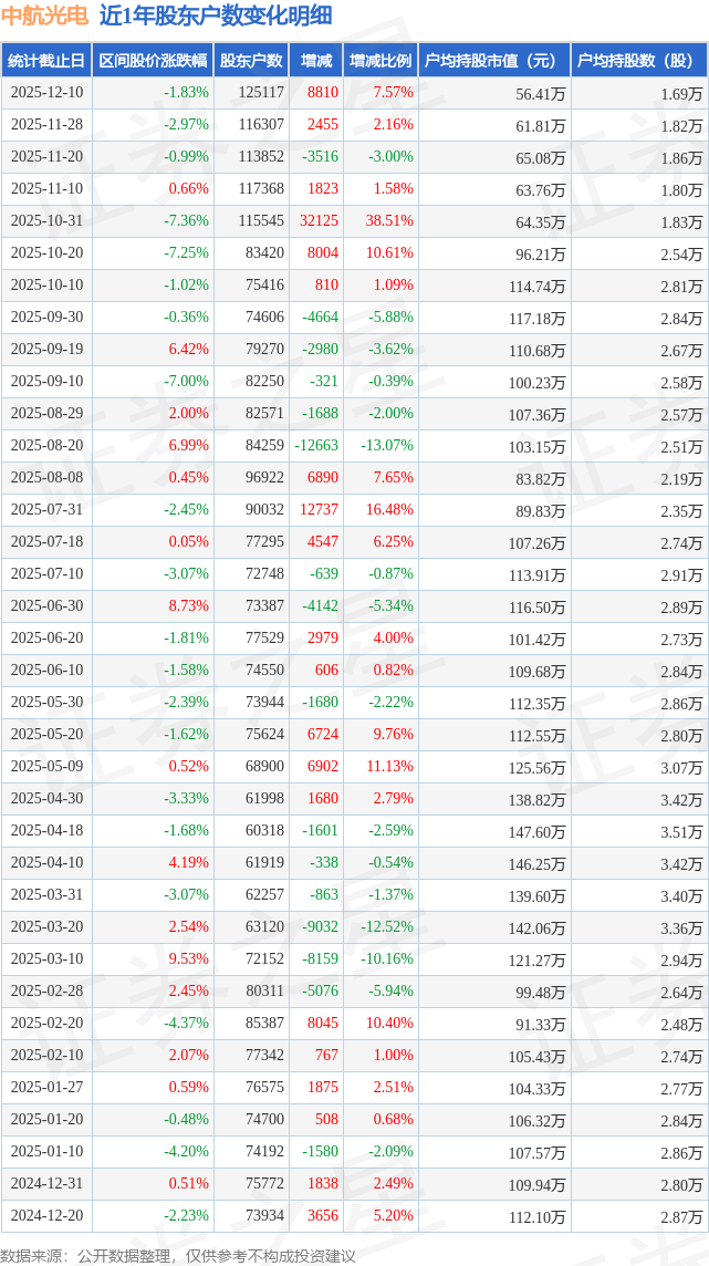 从股价来看,2025年11月28日至2025年12月10日,中航光电区间跌幅为1.83%,在此期间股东户数增加8810.0户,增幅为7.57%。
