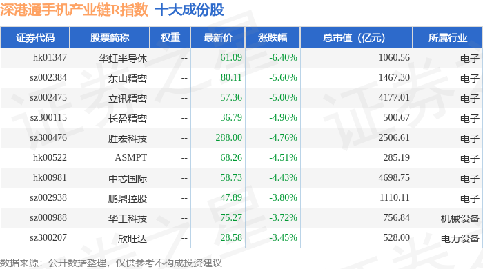 深港通手机产业链R(483009)指数十大成份股详情如下: