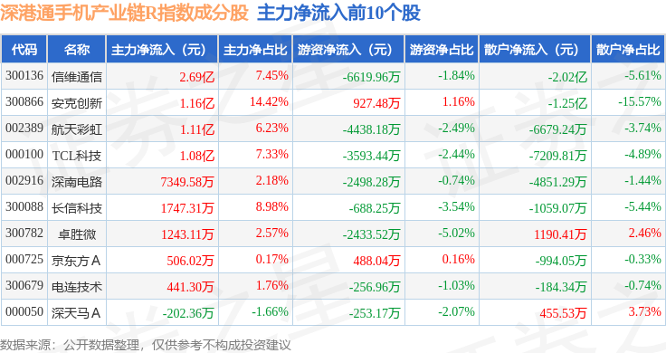 资金流向方面,深港通手机产业链R(483009)指数成份股当日主力资金净流出合计64.69亿元,游资资金净流入合计17.88亿元,散户资金净流入合计46.81亿元。成份股资金流向详情见下表: