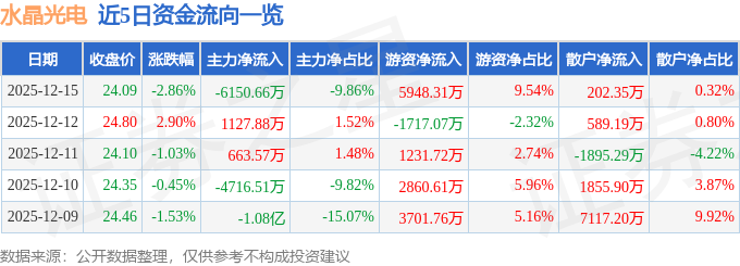 证券之星消息,截至2025年12月15日收盘,水晶光电(002273)报收于24.09元,下跌2.86%,换手率1.89%,成交量25.73万手,成交额6.24亿元。