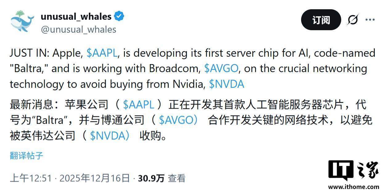 IT之家 12 月 16 日消息,科技媒体 Wccftech 昨日(12 月 15 日)发布博文,报道称苹果正在深化其“垂直整合”战略,不仅在消费电子端发力,更将触角伸向了核心算力基础设施,加速研发代号为“Baltra”的首款自研 AI 服务器芯片。
