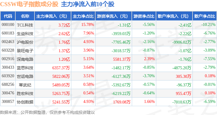 资金流向方面,CSSW电子(399811)指数成份股当日主力资金净流出合计35.92亿元,游资资金净流入合计4.72亿元,散户资金净流入合计31.2亿元。成份股资金流向详情见下表: