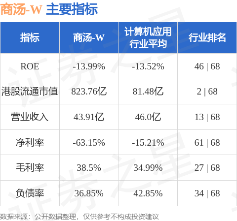 商汤-W港股市值823.76亿港元,在计算机应用行业中排名第2。主要指标见下表: