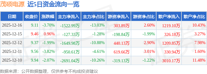 证券之星消息,截至2025年12月16日收盘,茂硕电源(002660)报收于9.11元,下跌3.7%,换手率3.71%,成交量12.72万手,成交额1.17亿元。