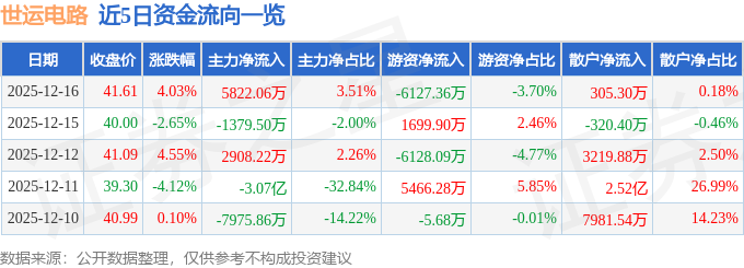 证券之星消息,截至2025年12月16日收盘,世运电路(603920)报收于41.61元,上涨4.02%,换手率5.48%,成交量39.52万手,成交额16.57亿元。