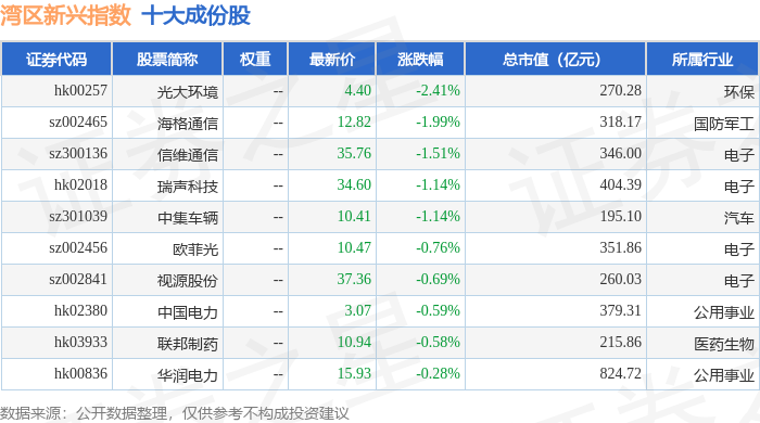 湾区新兴(980007)指数十大成份股详情如下: