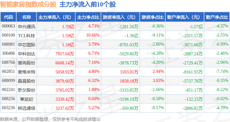 资金流向方面,智能家居(399996)指数成份股当日主力资金净流出合计21.69亿元,游资资金净流入合计575.72万元,散户资金净流入合计21.63亿元。成份股资金流向详情见下表: