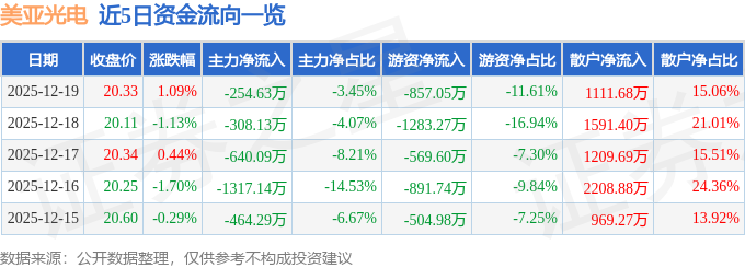 证券之星消息,截至2025年12月19日收盘,美亚光电(002690)报收于20.33元,上涨1.09%,换手率0.84%,成交量3.65万手,成交额7381.49万元。