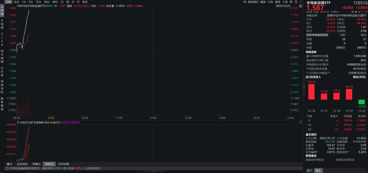 消息面,字节跳动计划2026年斥资230亿美元大举投资人工智能,谷歌推出Gemini3Flash模型,巨头加速布局,光刻机、半导体设备概念活跃,聚焦上游半导体设备领域的半导体设备ETF(159516)涨超2%。