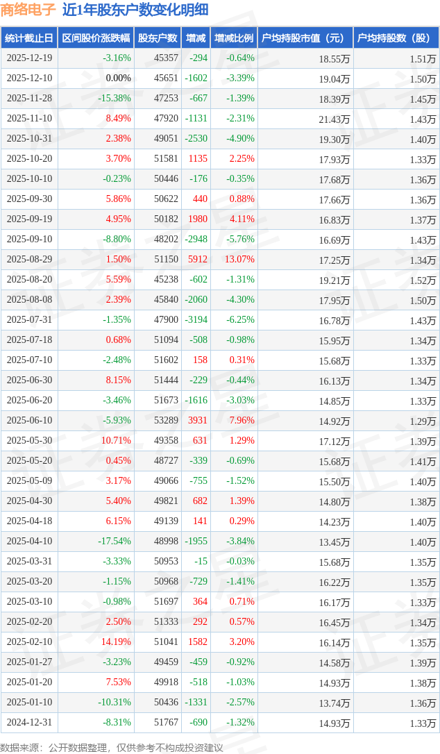 从股价来看,2025年12月10日至2025年12月19日,商络电子区间跌幅为3.16%,在此期间股东户数减少294.0户,减幅为0.64%。