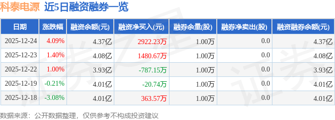 科泰电源融资融券信息显示,融资方面,当日融资买入1.07亿元,融资偿还7781.85万元,融资净买入2922.23万元。融券方面,融券卖出0.0股,融券偿还0.0股,融券余量1.0万股,融券余额30.81万元。融资融券余额4.37亿元。