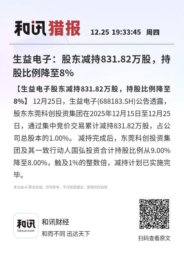 【生益电子股东减持831.82万股,持股比例降至8%】12月25日,生益电子(688183.SH)公告透露,股东东莞科创投资集团在2025年12月15日至12月25日,通过集中竞价交易累计减持831.82万股,占公司总股本的1.00%。减持完成后,东莞科创投资集团及其一致行动人国弘投资合计持股比例从9.00%降至8.00%,触及1%的整数倍,减持计划已实施完毕。