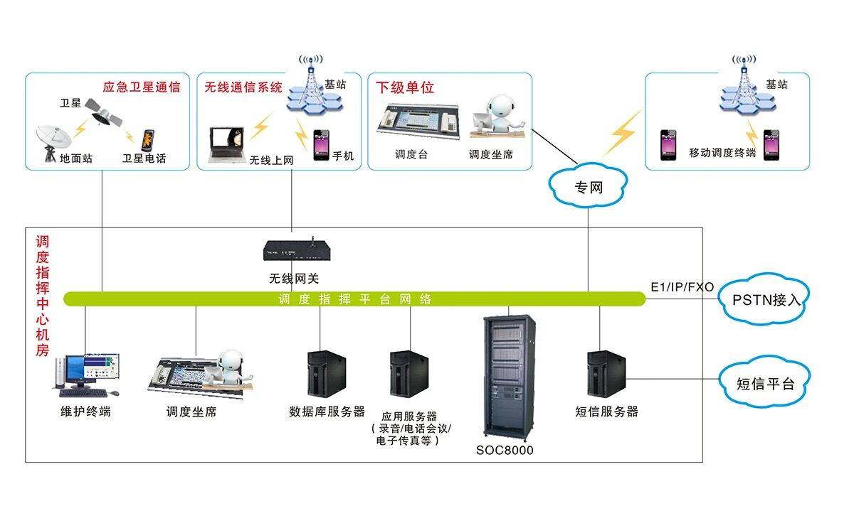 系统主要由调度控制中心、无线通信应用和应急卫星通信三部分组成。以智能电话、会议调度、录音系统、后台管理等系统为业务扩展支撑、以容灾系统为系统保障的大型综合呼叫调度平台。调度中心为该系统的核心,完成调度坐席话务转接、来电排队、来电提示、优先接听、电话会议、坐席签入签出、电话录音、路由备份、一键呼叫、强插/强拆等功能。