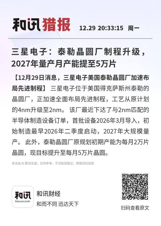 【12月29日消息,三星电子美国泰勒晶圆厂加速布局先进制程】三星电子位于美国得克萨斯州泰勒的晶圆厂,正加速全面布局先进制程,工艺从原计划的4nm升级至2nm。 该厂最近下达了与2nm匹配的半导体制造设备订单,首批设备2026年3月导入,初始制造最早2026年二季度启动,2027年大规模量产。 此外,泰勒晶圆厂原规划初期产能为每月2万片晶圆,现目标提升至每月5万片晶圆。