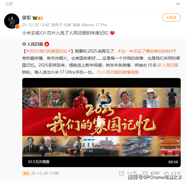 2025年12月30日消息,小米董事长兼CEO雷军昨日发布微博,小米玄戒O1芯片入选了人民日报的年度记忆。