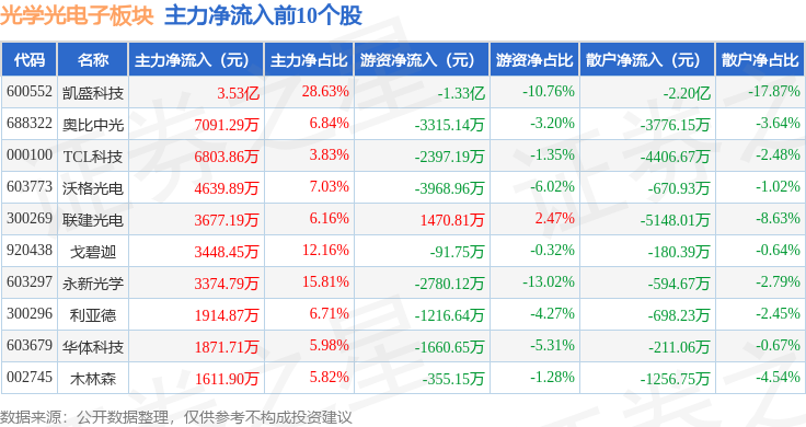 从资金流向上来看,当日光学光电子板块主力资金净流出7.02亿元,游资资金净流入1.03亿元,散户资金净流入5.99亿元。光学光电子板块个股资金流向见下表: