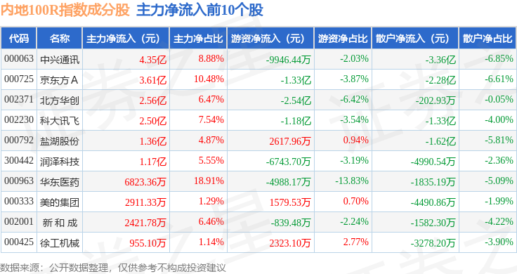 资金流向方面,内地100R(483001)指数成份股当日主力资金净流出合计81.87亿元,游资资金净流入合计30.67亿元,散户资金净流入合计51.21亿元。成份股资金流向详情见下表: