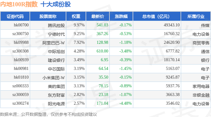 证券之星消息,12月31日,内地100R(483001)指数报收于2795.99点,跌0.96%,成交1649.75亿元,换手率0.5%。当日该指数成份股中,上涨的有23家,三花智控以5.35%的涨幅领涨,下跌的有74家,阳光电源以4.48%的跌幅领跌。