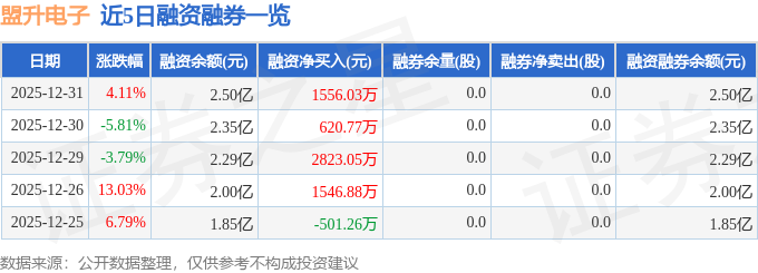 盟升电子融资融券信息显示,融资方面,当日融资买入8539.57万元,融资偿还6983.54万元,融资净买入1556.03万元,连续3日净买入累计4999.86万元。融券方面,融券卖出0.0股,融券偿还0.0股,融券余量0.0股,融券余额0.0万元。融资融券余额2.5亿元。