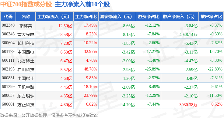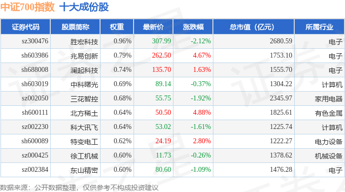 中证700(000907)指数十大成份股详情如下: