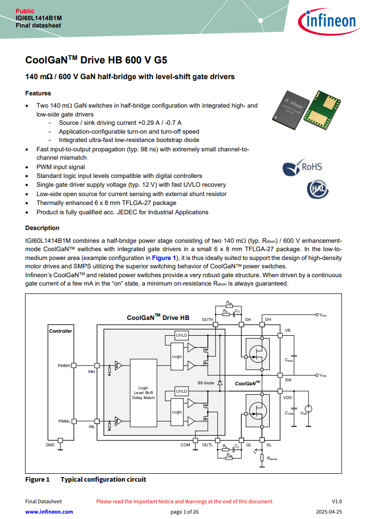 IGI60L1414B1M 集成了一个半桥功率级,该功率级由两个140 mΩ/600 V增强型CoolGaN开关与集成栅极驱动器组成,封装于小巧的 6 x 8 mm TFLGA-27 封装中。在低到中功率应用领域,它非常适合用于支持高功率密度的电机驱动和开关电源的设计,充分利用CoolGaN功率开关优异的开关特性。