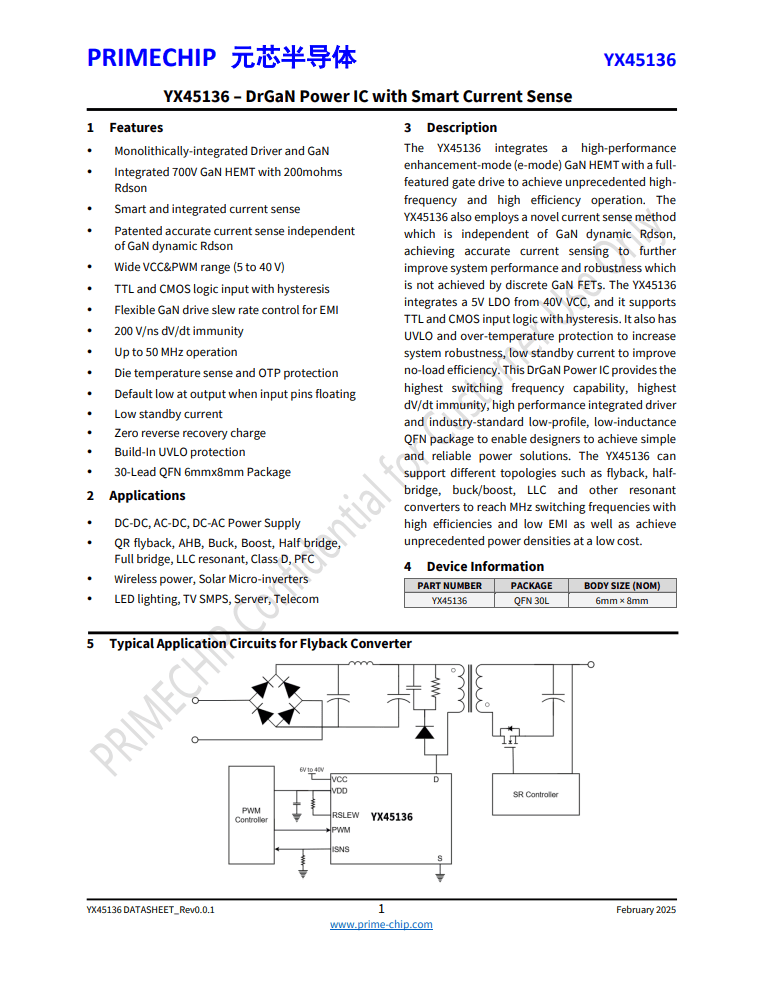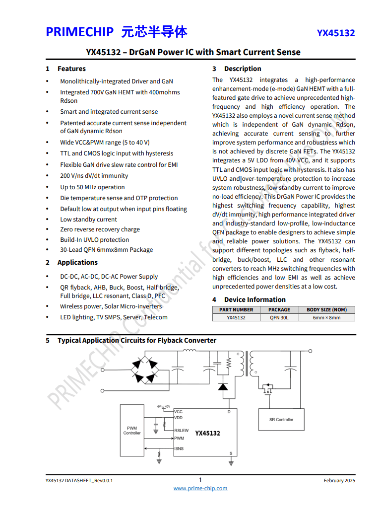 YX45132将导阻400mΩ的高性能增强型700V GaN HEMT与全功能栅极驱动器集成在一起,实现了高频率和高效率运行。该器件采用了一种新颖的电流检测方法,该方法不受GaN动态导通电阻影响,可实现精准电流检测,从而进一步提升系统性能和可靠性,这是分立GaN器件无法实现的。