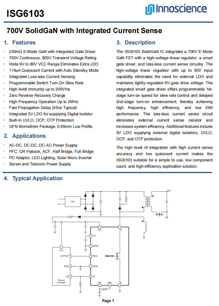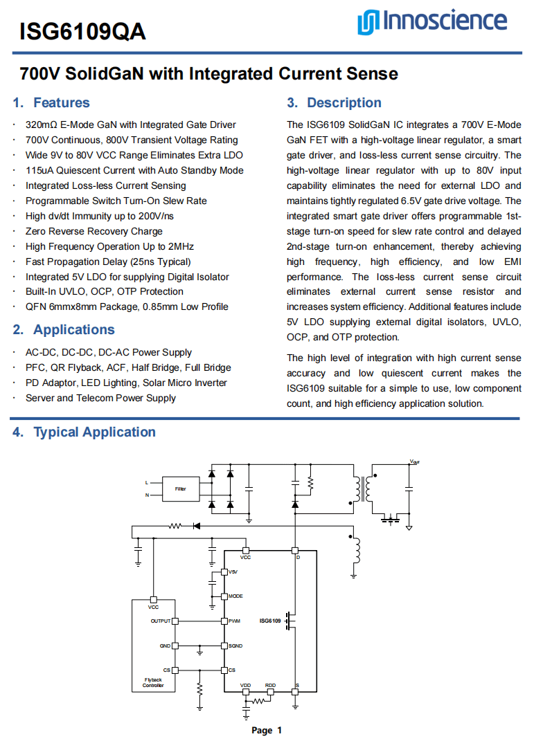 ISG6109可耐受700V连续电压,800V的瞬时电压,静态电流仅有115μA,支持自动待机模式,支持零反向恢复电荷,高频操作可达2MHz,集成5V LDO用于供电数字隔离器,内置的智能栅极驱动器提供可编程开关以控制转换速率,采用QFN6x8封装。