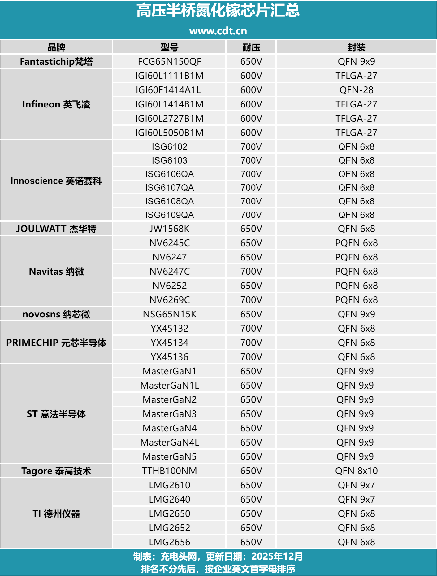 目前,国内外多家知名厂商已在650V/700V高压半桥GaN领域密局,产品线持续迭代。为此,本文系统梳理十大代表性厂商的核心半桥GaN芯片,剖析其关键参数与技术亮点,为行业提供客观参考与选型依据。