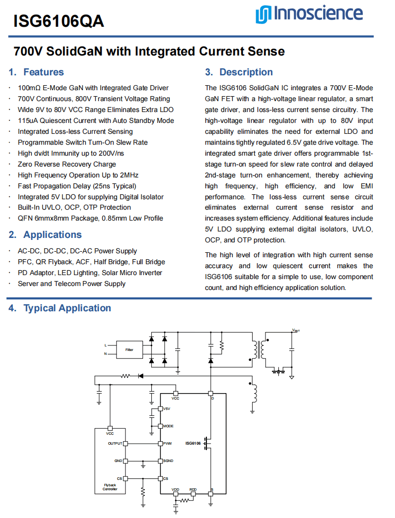 ISG6106可耐受700V连续电压,800V的瞬时电压,静态电流仅有115μA,支持自动待机模式,支持零反向恢复电荷,高频操作可达2MHz,集成5V LDO用于供电数字隔离器,内置的智能栅极驱动器提供可编程开关以控制转换速率,采用QFN6x8封装。