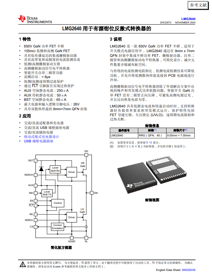 LMG2640 具有低静态电流和快速启动时间,支持转换器轻负载效率要求和突发模式运行。保护特性包括FET 导通互锁、欠压锁定 (UVLO)、逐周期电流限制和过热关断。