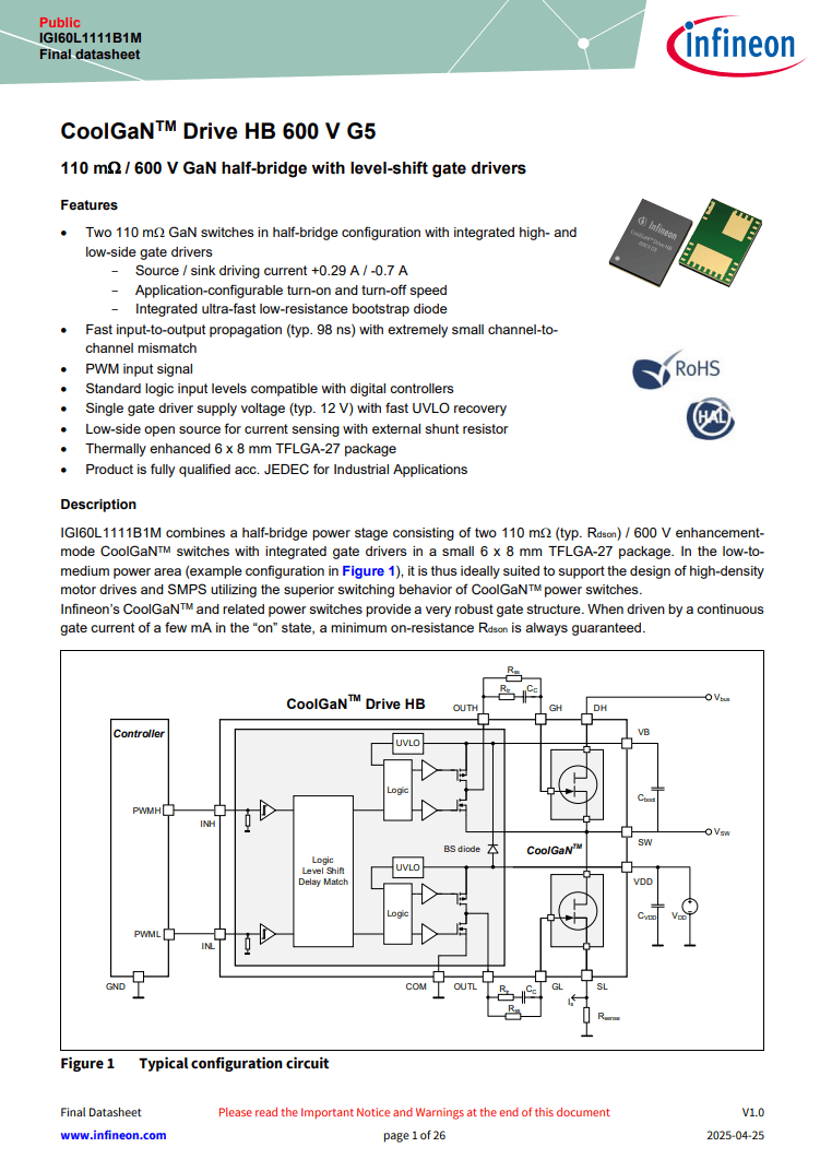 IGI60L1111B1M集成了一个半桥功率级,由两个110 mΩ/600 V增强型 CoolGaN开关 和集成栅极驱动器组成,封装在紧凑的6 x 8 mm TFLGA-27封装内。在低至中功率应用场景下,该器件非常适合用于支持高功率密度电机驱动和开关电源的设计,充分利用 CoolGaN功率开关优异的开关特性。