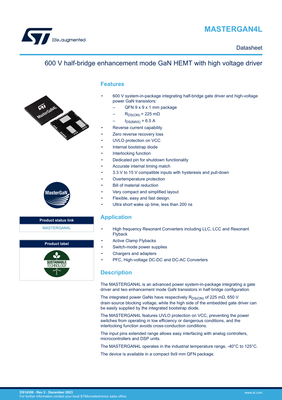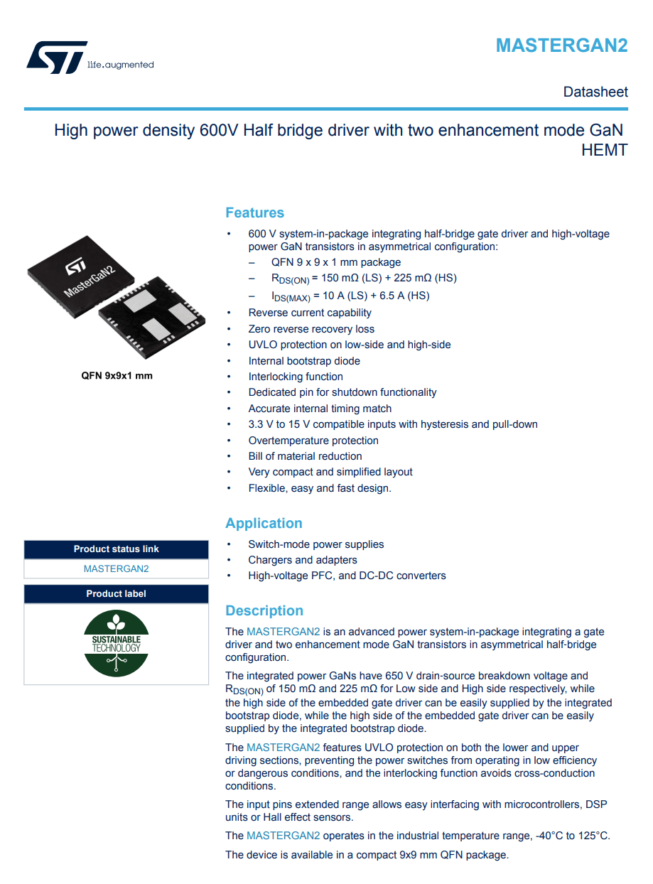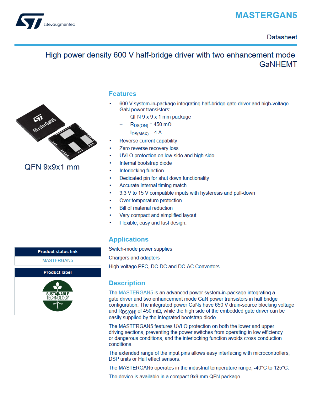 MASTERGAN5是一款先进的功率系统封装集成,采用门极驱动器和两个增强模式GaN功率晶体管的半桥配置。集成的功率GaNs具有650V的击穿电压,同时嵌入式门极驱动器的高侧可以通过集成的二极管轻松供电。