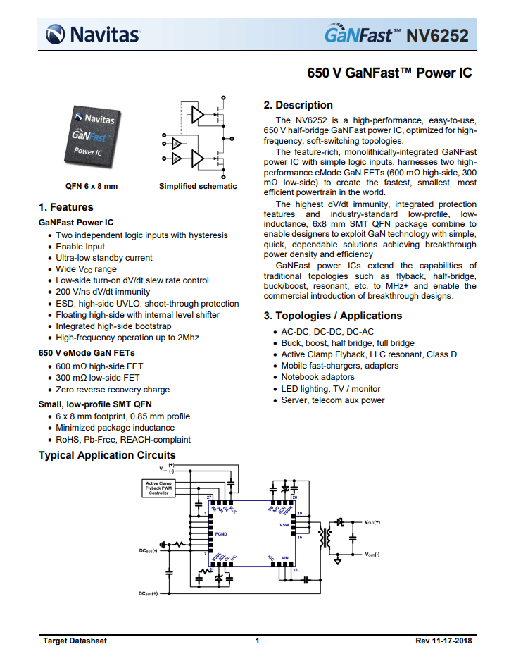 NV6252 采用QFN 6×8封装,封装厚度仅0.85 mm,可广泛适用于 AC-DC、DC-DC、DC-AC 电源架构,包括 反激、LLC 谐振、Buck/Boost、半桥及全桥拓扑。典型应用场景涵盖 快充适配器、笔记本电脑电源、服务器与通信辅助电源、LED 照明、显示器电源以及高性能 Class-D 功放 等,是新一代高效率、高集成度电源设计的理想选择。