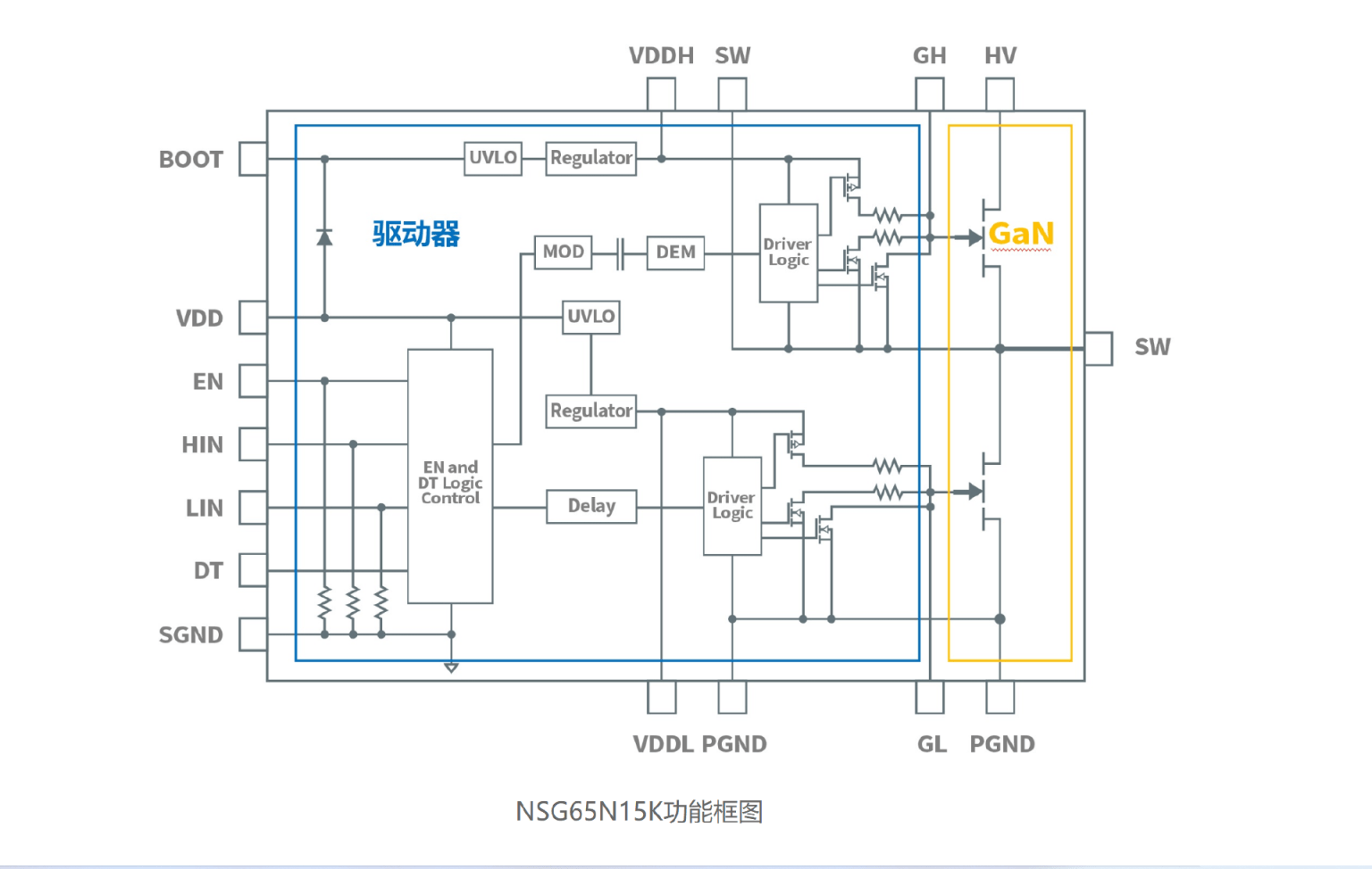 为进一步发挥GaN高频、高速的特性优势,纳芯微同时推出了集成化的Power Stage产品NSG65N15K,内部集成了半桥驱动器NSD2621和两颗耐压650V、导阻电阻150mΩ的GaN开关管,工作电流可达20A。NSG65N15K内部还集成了自举二极管,并且内置可调死区时间、欠压保护、过温保护功能,可以用于图腾柱PFC、ACF和LLC等半桥或全桥拓扑。