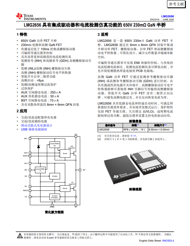 智能开关 GaN 自举 FET 没有二极管正向压降,可避免高侧电源过充,并且反向恢复电荷为零。LMG2656 具有低静态电流和快速启动时间,可满足转换器轻负载效率要求,并实现突发模式运行。保护特性包括 FET 导通互锁、欠压锁定 (UVLO)、逐周期电流限制和过热关断。超低压摆率设置支持电机驱动应用。