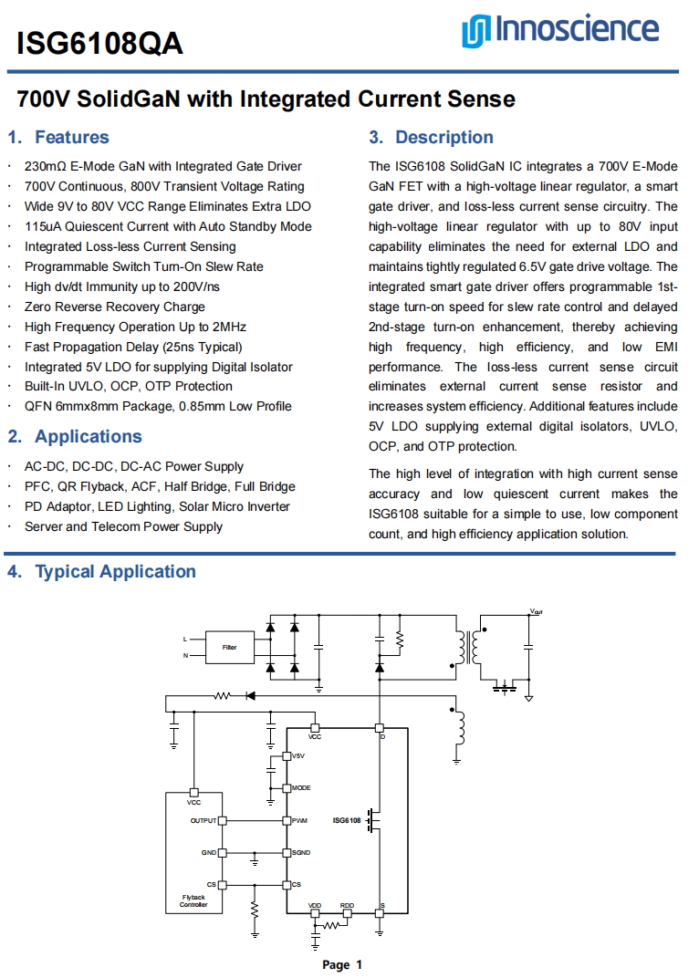 ISG6108可耐受700V连续电压,800V的瞬时电压,静态电流仅有115μA,支持自动待机模式,支持零反向恢复电荷,高频操作可达2MHz,集成5V LDO用于供电数字隔离器,内置的智能栅极驱动器提供可编程开关以控制转换速率,采用QFN6x8封装。