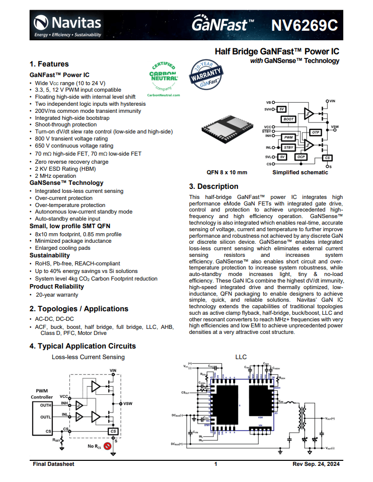纳微NV624X半桥氮化镓功率芯片集成的 GaNSense 技术实现了前所未有的自动保护,提升了系统可靠性和稳定性,并结合了无损电流感测,达到更高层级的效率和节能水平。