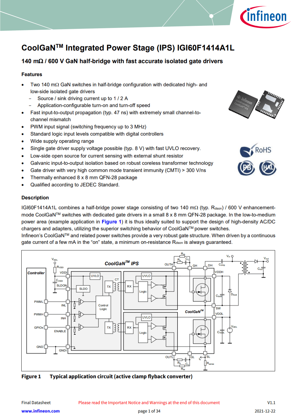 1、 英飞凌推出30W-500W快充应用CoolGaN氮化镓产品