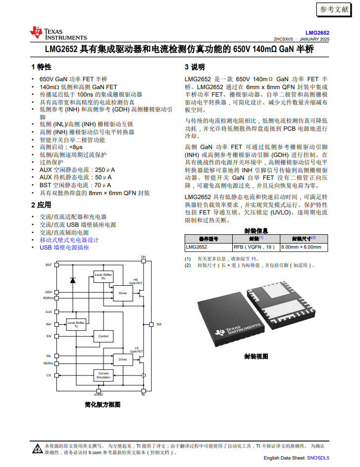 LMG2652 具有低静态电流和快速启动时间,可满足转换器轻负载效率要求,并实现突发模式运行。保护特性包括 FET 导通互锁、欠压锁定 (UVLO)、逐周期电流限制和过热关断。