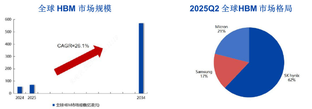 全球 HBM 市场增长迅猛,据 Market Research Future 数据, 2024 年市场规模 56.1 亿美元,预计 2034 年达 570.9 亿美元,2024-2034 年复合增长率 26.1%,是存储赛道增长黑马。
