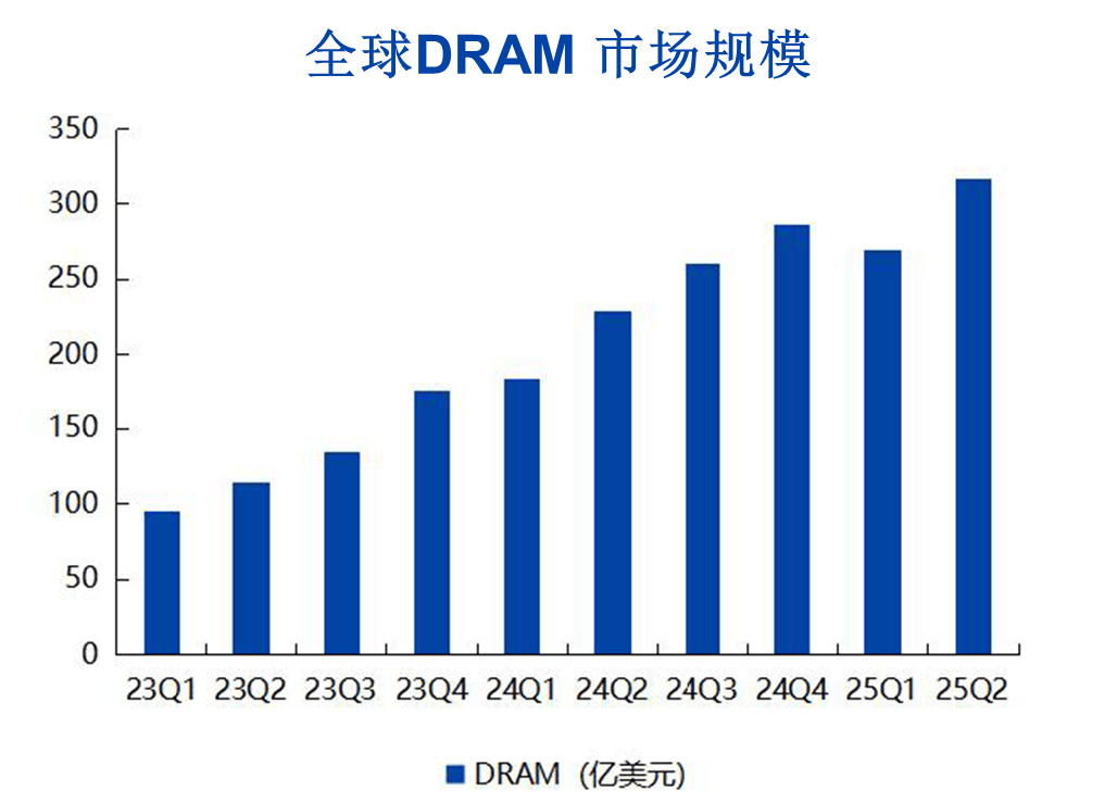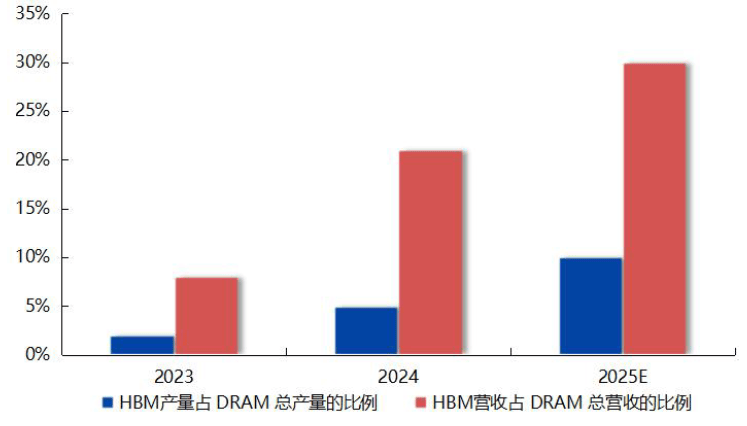 2023-2025 年, HBM 在 DRAM 市场的渗透率爬坡提速:2023 年产量、营收占比仅为 2%、8%;2025 年预计跃升至 10%、30%。