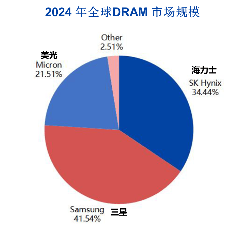 全球 DRAM 市场呈现典型的寡头垄断格局。据 DRAMeXchange 与 TrendForce 数据,2024 年 SK Hynix、三星、美光三家企业合计拿下 97.49% 的市场份额,如同三足鼎立的巨头联盟,几乎包揽了整个赛道的话语权。