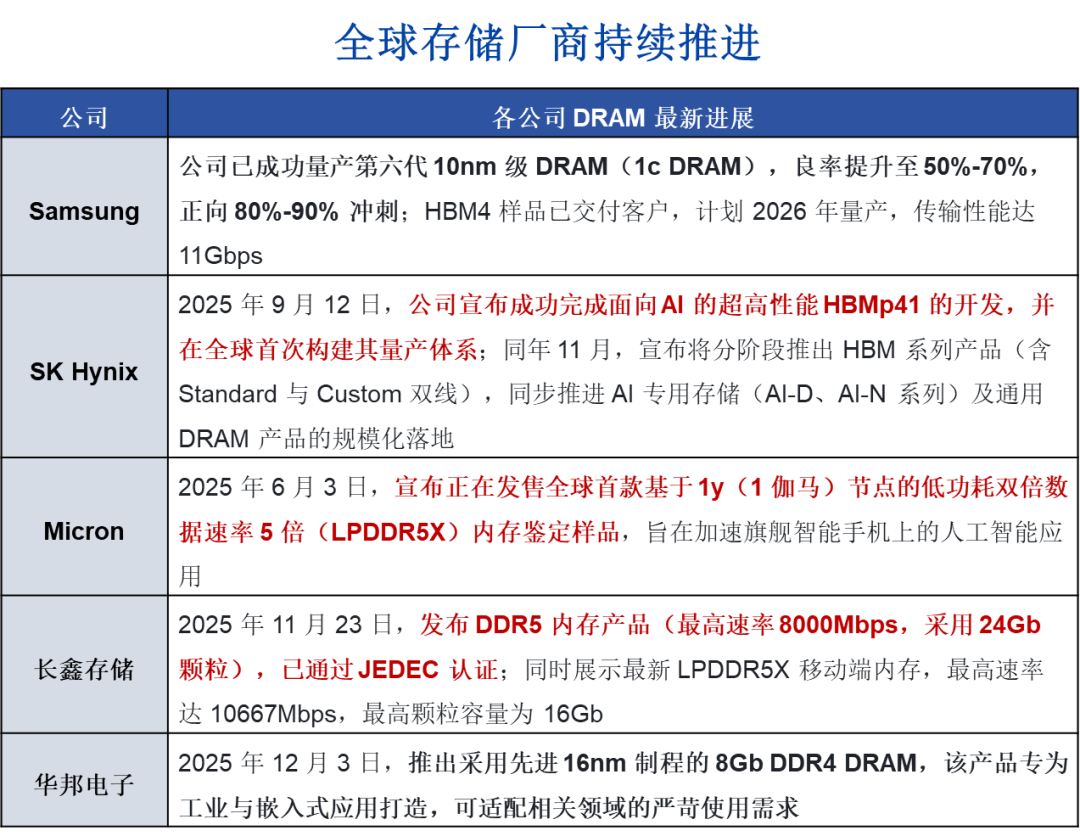 全球存储厂商在 DRAM 赛道全力提速,技术迭代按下快进键:三星量产第六代 10nm 级 1c DRAM,同步交付 HBM4 样品并锁定 2026 年量产,如同赛道上的技术标杆; 美光推出全球首款 1γ 节点 LPDDR5X 内存样品,成为旗舰机 AI 应用的性能基石;
