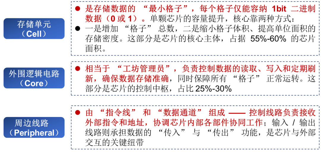 DRAM 芯片的结构可拆解为三个核心部分,如同一个高效运转的 “数据存储工坊”: