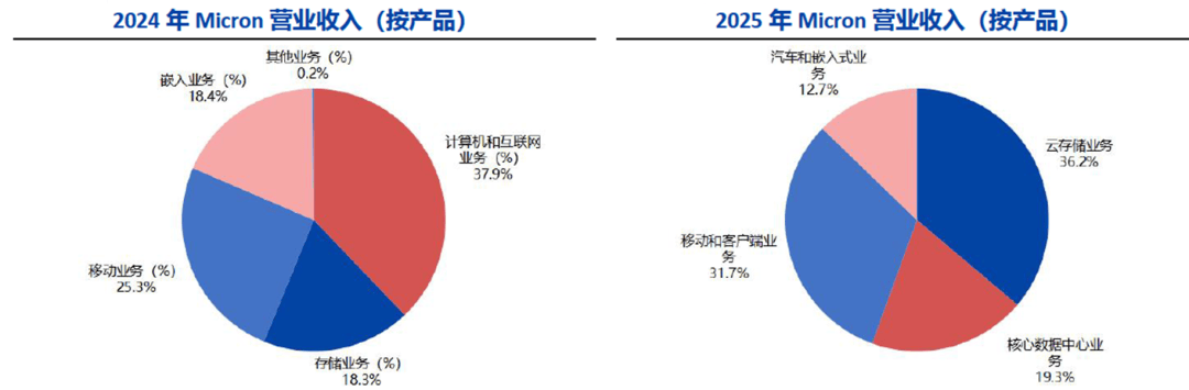 2024 年美光营收主力:计算机互联网(95.1 亿,37.9%)、移动业务(63.5 亿,25.3%)。