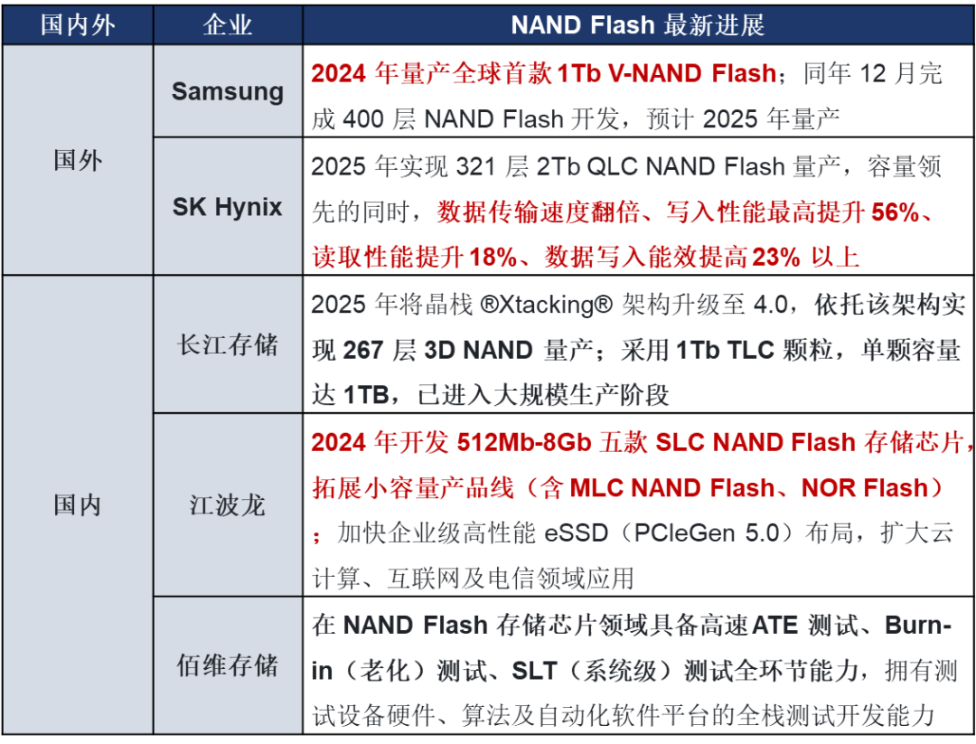 国外阵营中,三星 2024 年量产全球首款 1Tb V-NAND Flash,同年完成 400 层产品开发并计划 2025 年量产;SK 海力士 2025 年量产 321 层 2Tb QLC NAND Flash,实现传输速度翻倍、读写性能与能效大幅跃升。