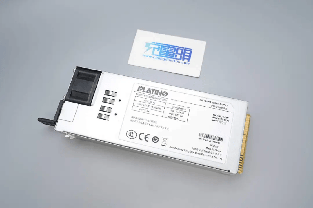 铂科电子800W服务器电源型号为BCSE800AP-12E01,电源支持100~240V交流输入,额定输出电压为12V,输出电流为66.7A,待机电源输出为12V,额定输出电流3A。电源模块内置散热风扇,从输出侧吸入空气,从输入端吹出散热。