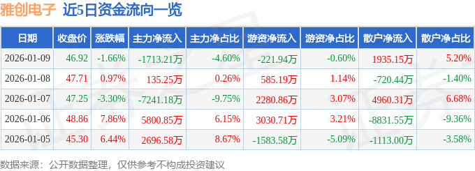 证券之星消息,截至2026年1月9日收盘,雅创电子(301099)报收于46.92元,下跌1.66%,换手率8.84%,成交量7.94万手,成交额3.72亿元。