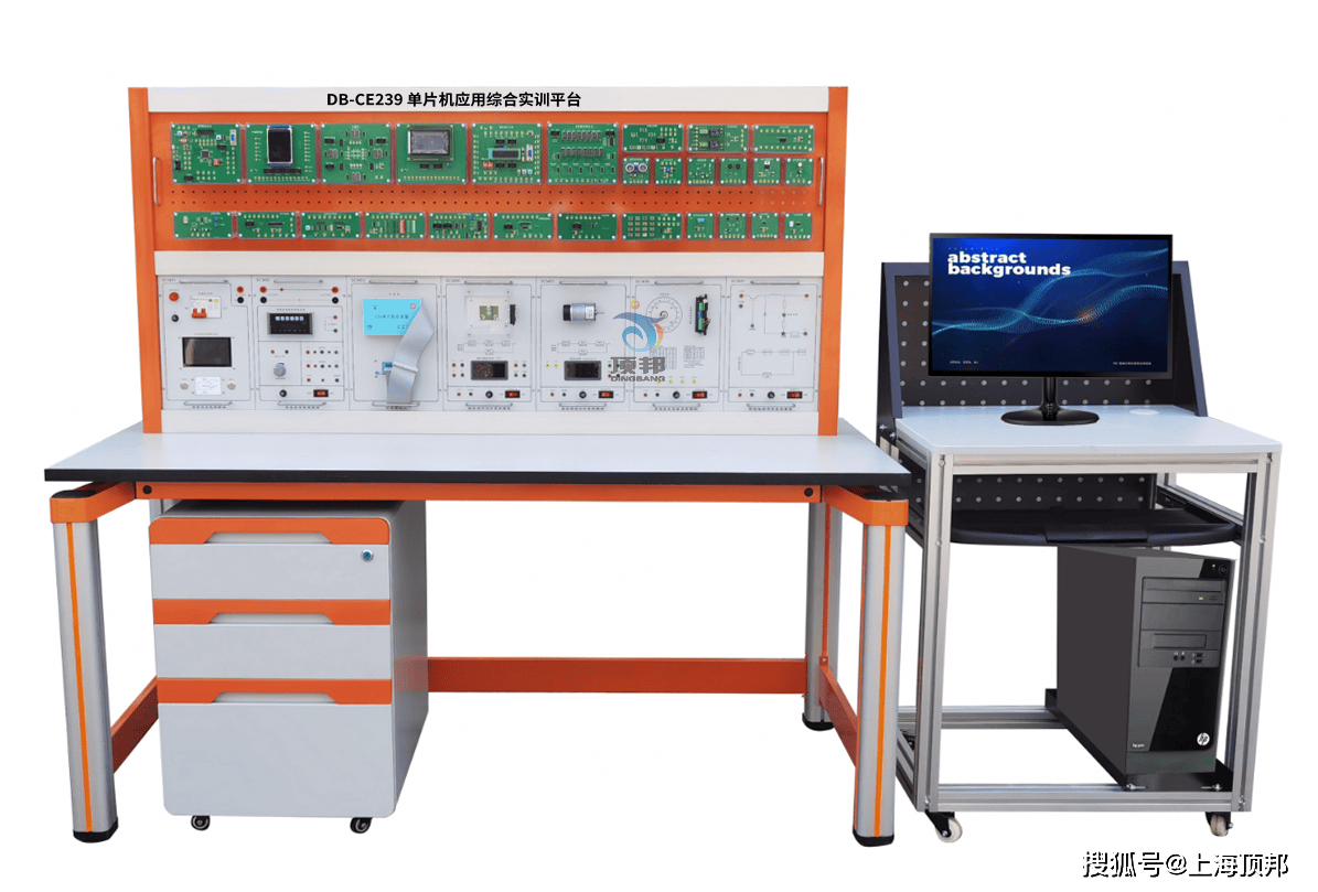 单片机应用综合实训平台主要由实训台、电源挂件、直流电源/直流电压表挂件、仿真器挂件、直流调速闭环系统挂件、温度调节闭环系统挂件、步进电机控制系统挂件、数控电源研究系统挂件、实训挂板、实训模块、电脑桌、活动柜及配件等组成。