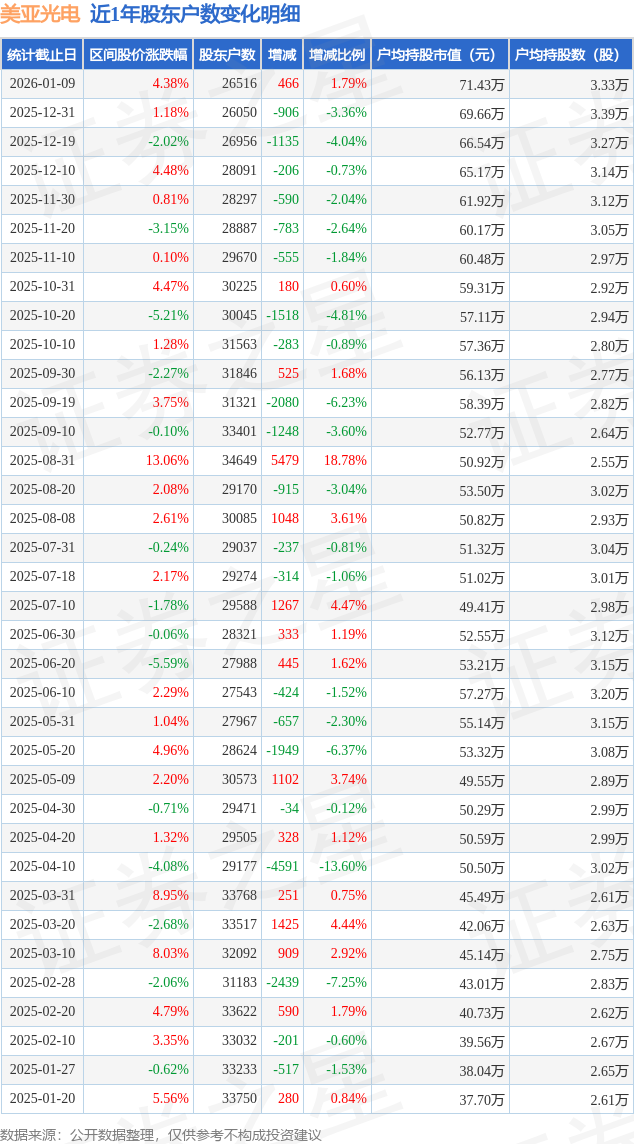 从股价来看,2025年12月31日至2026年1月9日,美亚光电区间涨幅为4.38%,在此期间股东户数增加466.0户,增幅为1.79%。